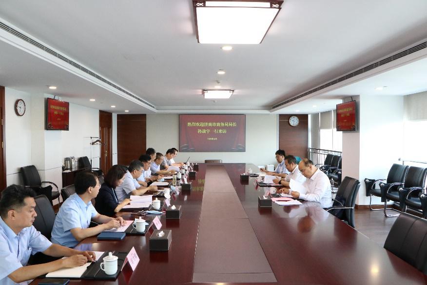 6月24日,济南市商务局党组书记、局长孙战宇一行到必赢调研驻济省属企业座谈会召开以来有关工作进展情况,集团党委副书记、总经理郭训成,副总经理赵西亮、张建军,济南市商务局党组成员、副局长滕志超出席活动。