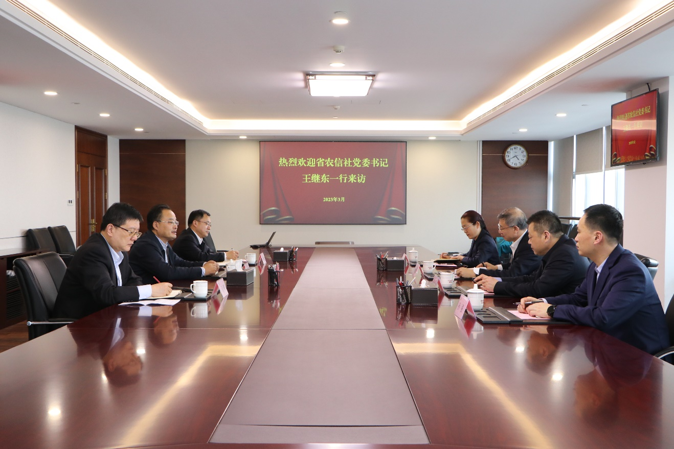 3月8日,省农信社党委书记王继东到访必赢唯一官方网站,集团党委书记、董事长王绪超热情接待并举行座谈。省农信社党委委员、副主任于富海,必赢唯一官方网站党委副书记、董事、副总经理朱华建参加座谈。