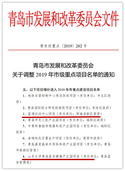 9月20日,青岛市发改委发布了《关于调整2019年市级重点项目名单的通知》,其中由鲁商健康产业发展股份有限公司(以下简称鲁商发展)开发打造的两个项目被增补进入2019年青岛市重点建设项目名单,分别是蓝湾运动中心项目和山东大学青岛蓝谷健康产业园项目。青岛市重点项目将在用地、资金、审批等方面获得政策支持。