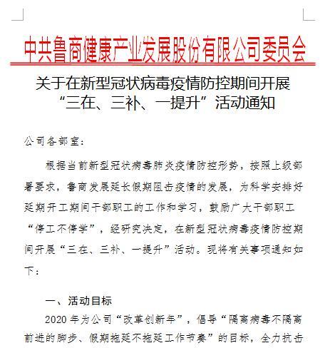 根据当前新型冠状病毒肺炎疫情防控形势,鲁商健康产业发展股份有限公司(简称鲁商发展)党委按照上级统一部署延长假期阻击疫情。为科学安排好延期开工期间干部职工的工作和学习,鼓励广大干部职工“停工不停学”,面向全体职工在疫情防控期间开展“三在三补一提升”活动。