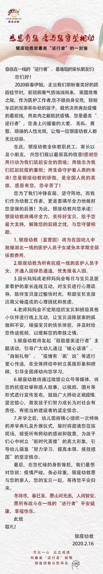 2月16日,银座幼教发布“致最美‘逆行者’的一封信”——《感恩有您 愿与您守望相助》。银座幼教(直营园)将为在园幼儿中驰援湖北一线的医护人员子女减免本学期全部保教费用。同时,还将为所有战疫一线的医护人员子女开通入园绿色通道,优先报名入园。