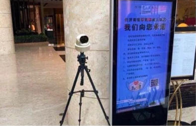 酒店大堂安装无感红外测温新装备,智能刷脸即时完成体温测量,将隐患阻隔于店外。