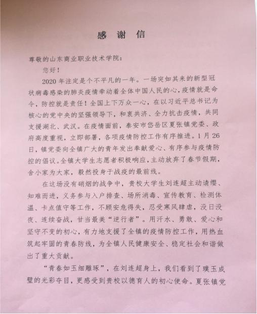 近日,山东商院收到了一封来自泰安市岱岳区夏张镇的感谢信,信中对学院刘连超同学在当地疫情防控工作中的付出与贡献表示感谢。