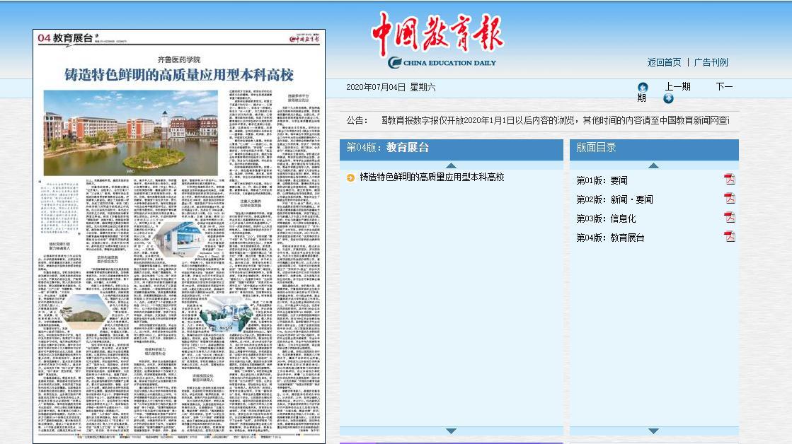 7月4日,《中国教育报》第4版以《齐鲁医药学院:铸造特色鲜明的高质量应用型本科高校》为题,整版报道学院办学情况。