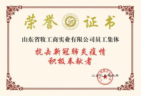 日前,牧工商被山东省饲料行业协会授予“抗击新冠肺炎疫情积极奉献者”称号。