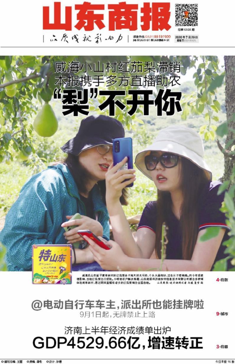 全民战疫,爱心助农。自新冠肺炎疫情发生以来,农业大省山东多地的优质农产品出现滞销现象。作为省级主流媒体,躬身践行“四力”的山东商报第一时间推出“特山东”品牌,派出记者走进田间地头开播,帮助农户“直播带货” ,大力宣传“乡村好品”,让众多滞销的农产品找到出路,解决了农户的燃眉之急,受到了社会的广泛赞誉。