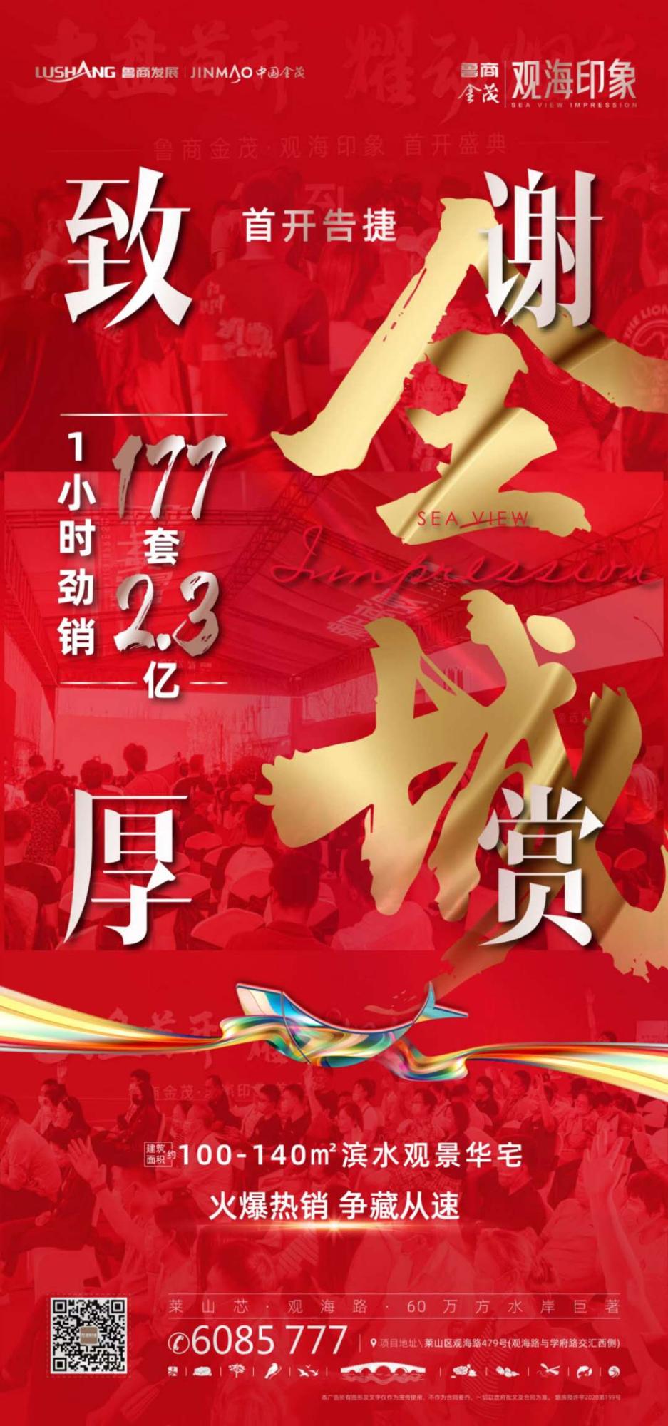 9月26日下午,鲁商健康产业发展股份有限公司(简称鲁商发展)烟台公司鲁商金茂·观海印象盛大开盘,首开告捷,一小时的时间里劲销177套,认购额达2.3亿元,去化率优良。