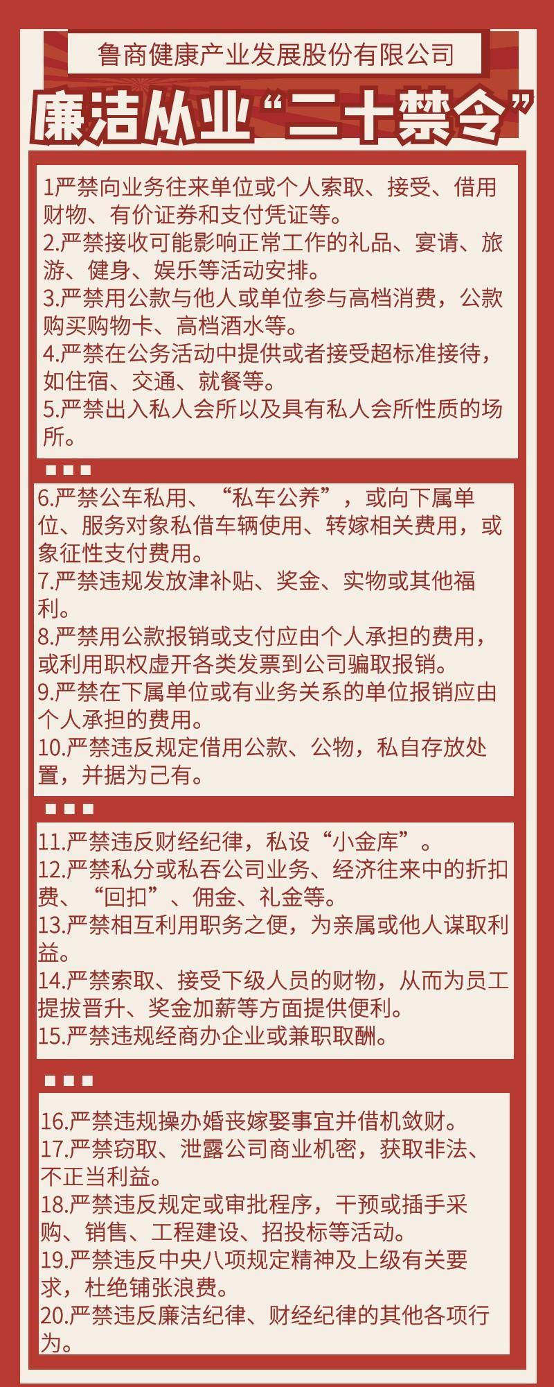 为加强党风廉政建设,促进公司依法经营、员工廉洁从业,近日,鲁商发展制定《廉洁从业“二十禁令”》(以下简称“二十禁令”),为公司全体党员干部职工划定负面清单,提出硬性要求。
