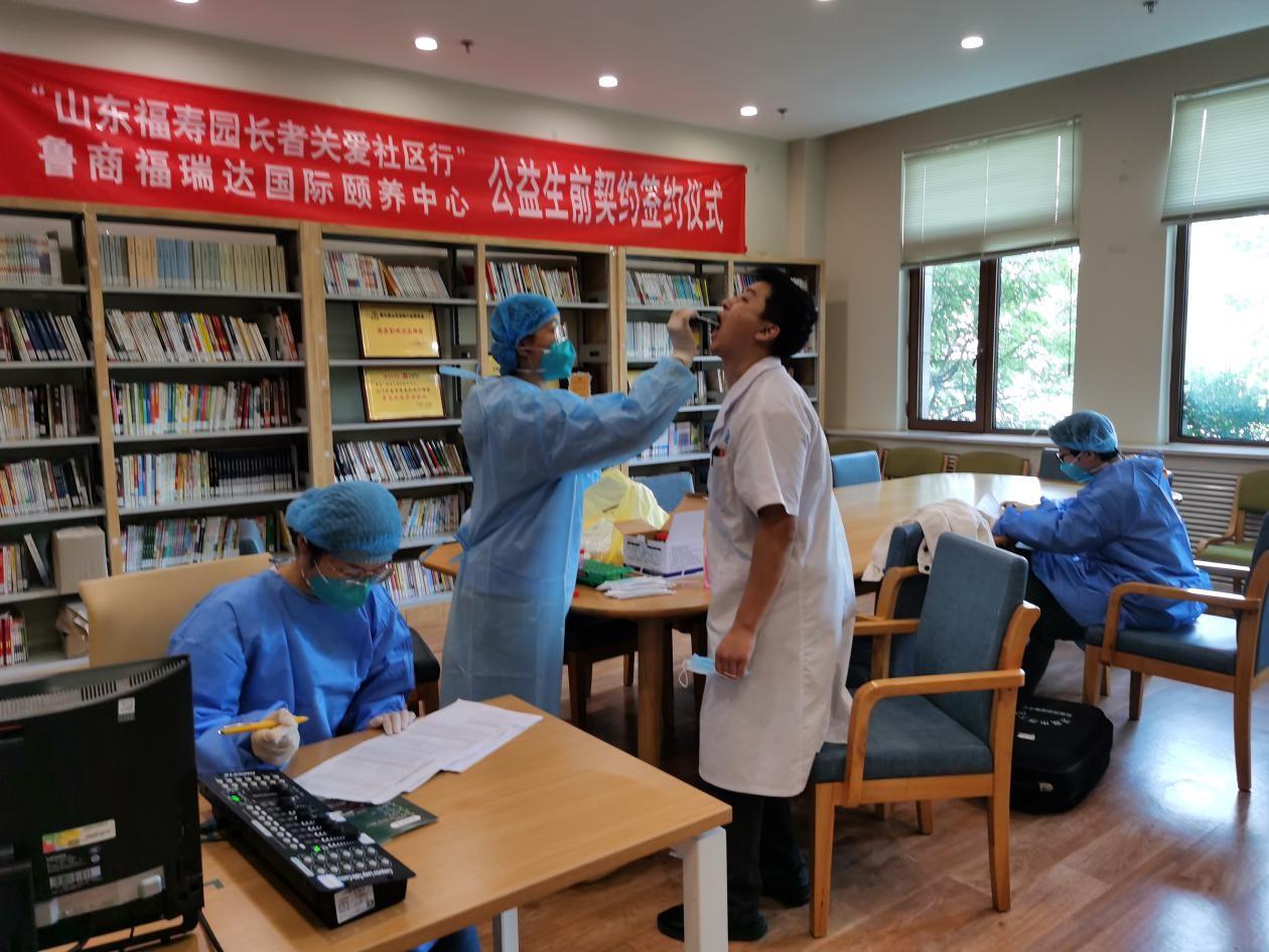 为确保全体员工安全和机构内长者身体健康,10月12日上午,济南市历下区疾控中心对鲁商福瑞达国际颐养中心内的全部员工进行咽拭子取样核酸检测,检测结果全部为阴性。中心每日对全体长者及员工进行体温测量登记,严格落实一切消杀防疫工作。中心大门也持续关闭,家属及来访者非预约不可探视。