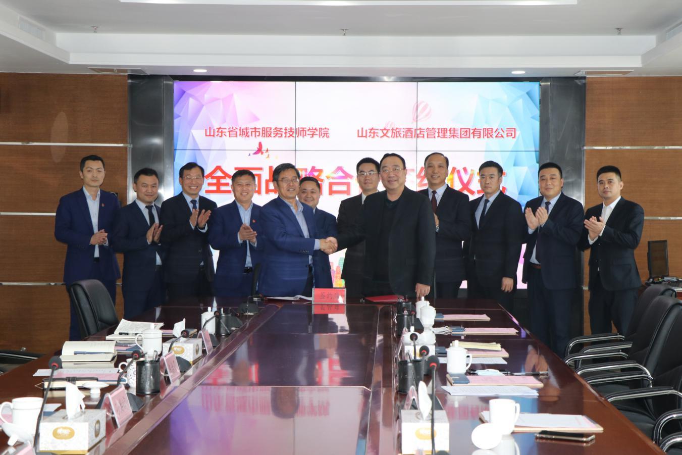 3月10日,省城市学院与山东文旅酒店集团“校企战略合作签约仪式”在烟台举行。省城市学院党委书记宋宁,院长陈治果,山东文旅酒店集团党委副书记、总经理周立刚出席活动。