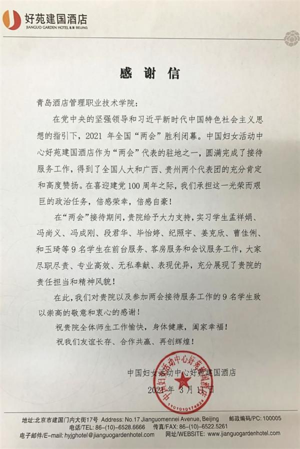 3月4日至11日,备受关注的2021年全国两会在京召开,青岛酒店学院2019级酒店管理专业在京实习的部分同学积极投入两会服务工作中,多家酒店发来表扬信并赠送锦旗。