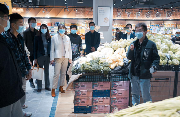 山东商院市场营销专业2018级学生徐栋来银座集团实习不到7个月,已经是超市生鲜课的助理了,他在负责的蔬菜区现场和学弟学妹进行了深入交流。他介绍,实习后在师傅传帮带的指导下,自己坚定了承担压力的决心,经过“银座广场超市30天重装开业”这件大事,从一个腼腆的大学生变成了无论面对任何事情都不畏惧、都能得当处理的职场人。