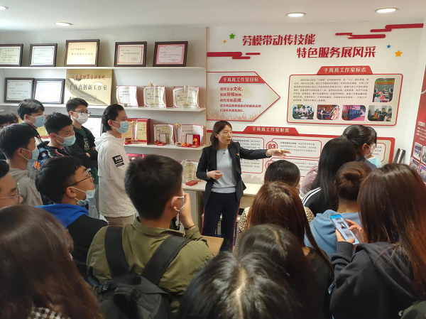 在银座商城“于真真创新工作室”,速打领带世界吉尼斯纪录保持者、全国劳模、山东省富民兴鲁劳动奖章获得者于真真与同学们亲切交流,并现场展示了速打领带技能。同学们被她精益求精、勇攀高峰的事迹所震撼,决心在劳动实践基地潜心锤炼技能,做齐鲁新工匠。