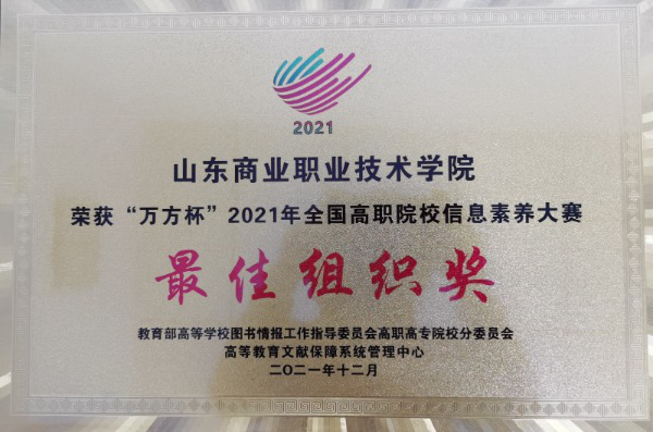 近日,教育部高等学校图书情报工作指导委员会为山东商院颁发“万方杯”2021年全国高职院校信息素养大赛最佳组织奖。