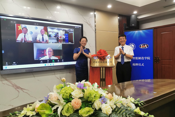 王鑫、宋超代表山东商院为中德智能制造学院揭牌,Weis及德国欧洲学院相关负责人共同在线见证。