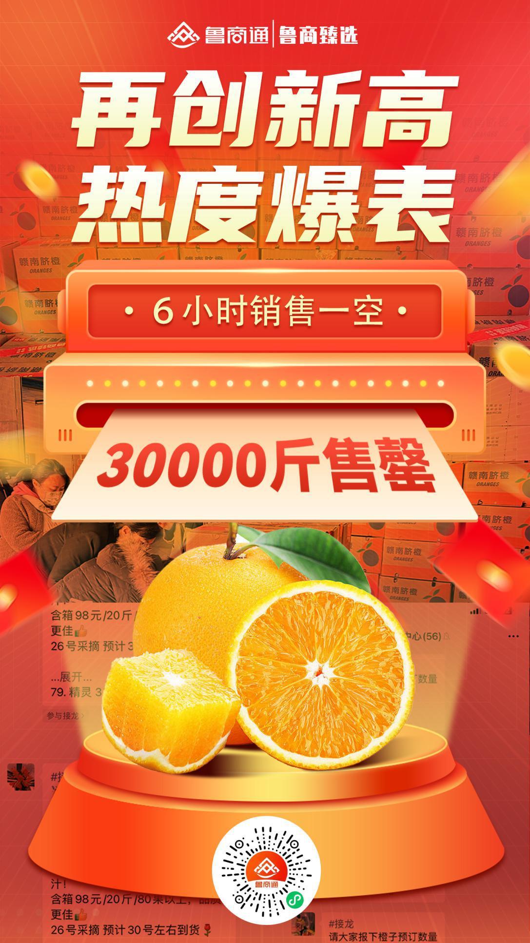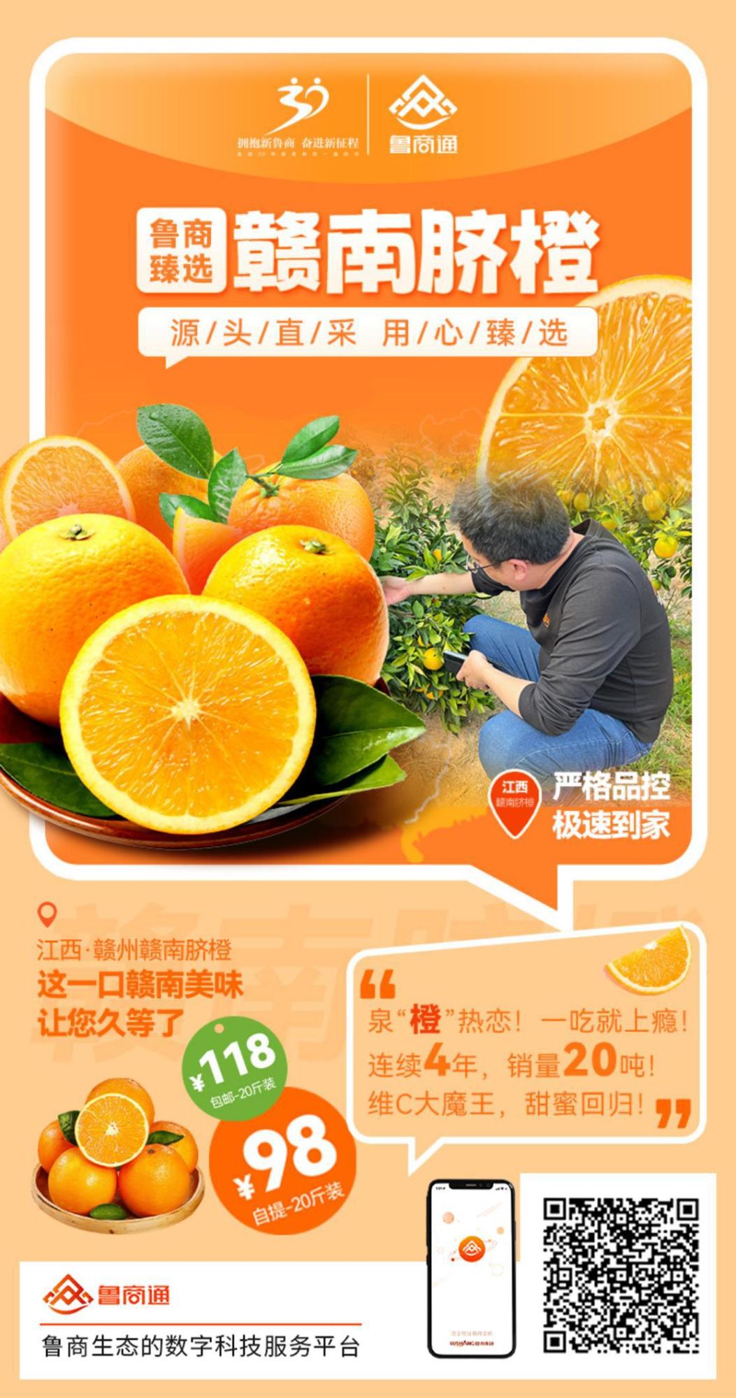 眼下正值赣南脐橙采摘旺季,为帮助果农解决疫情和天气等因素影响导致的销售难题,鲁商通利用“社群+电商+体验中心”等多元化方式,上线6小时即售出3万斤,3天时间6万斤脐橙销售一空。