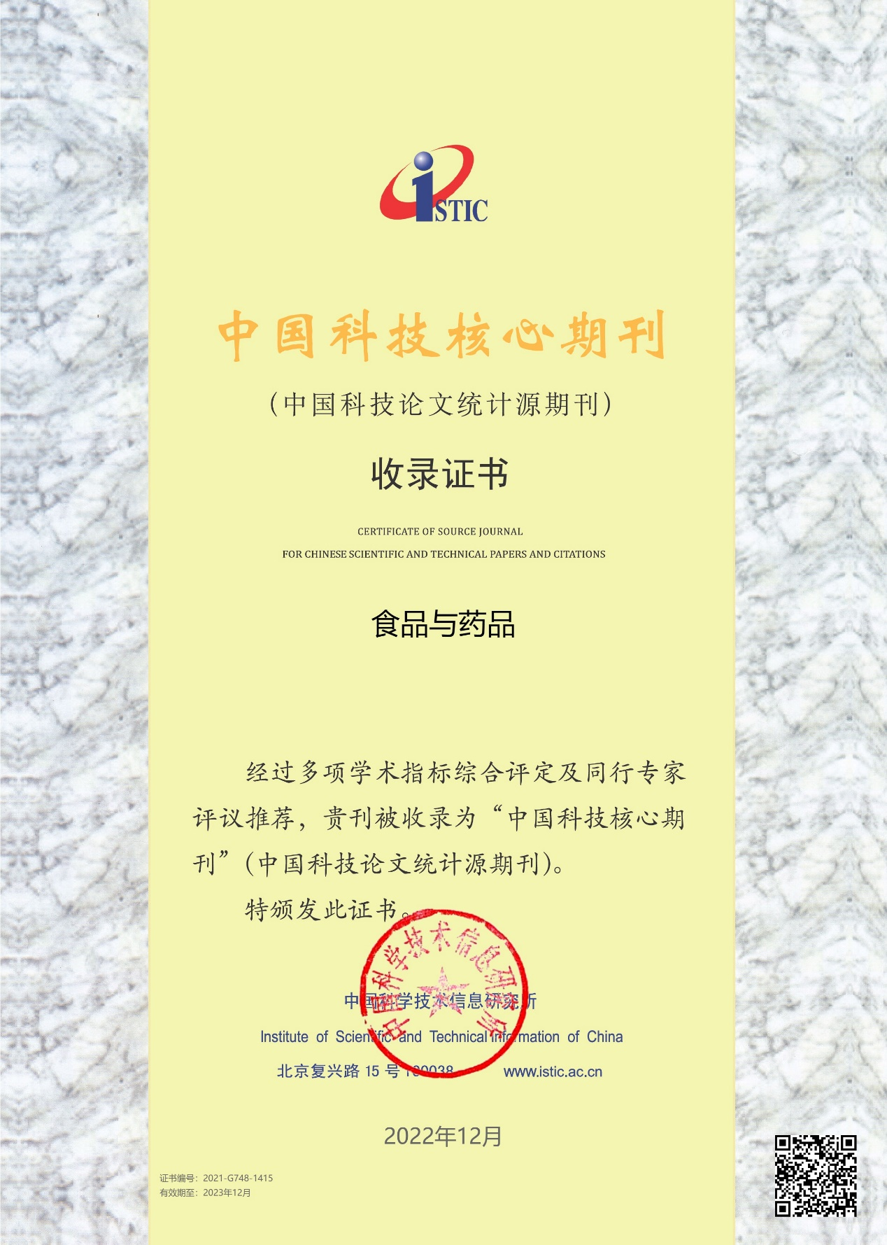 近日,2022年中国科技核心期刊(中国科技论文统计源期刊,CSTPCD)目录发布,由必赢唯一官方网站主管和山东省药学科学院主办的《食品与药品》实现连续多年入选此目录。