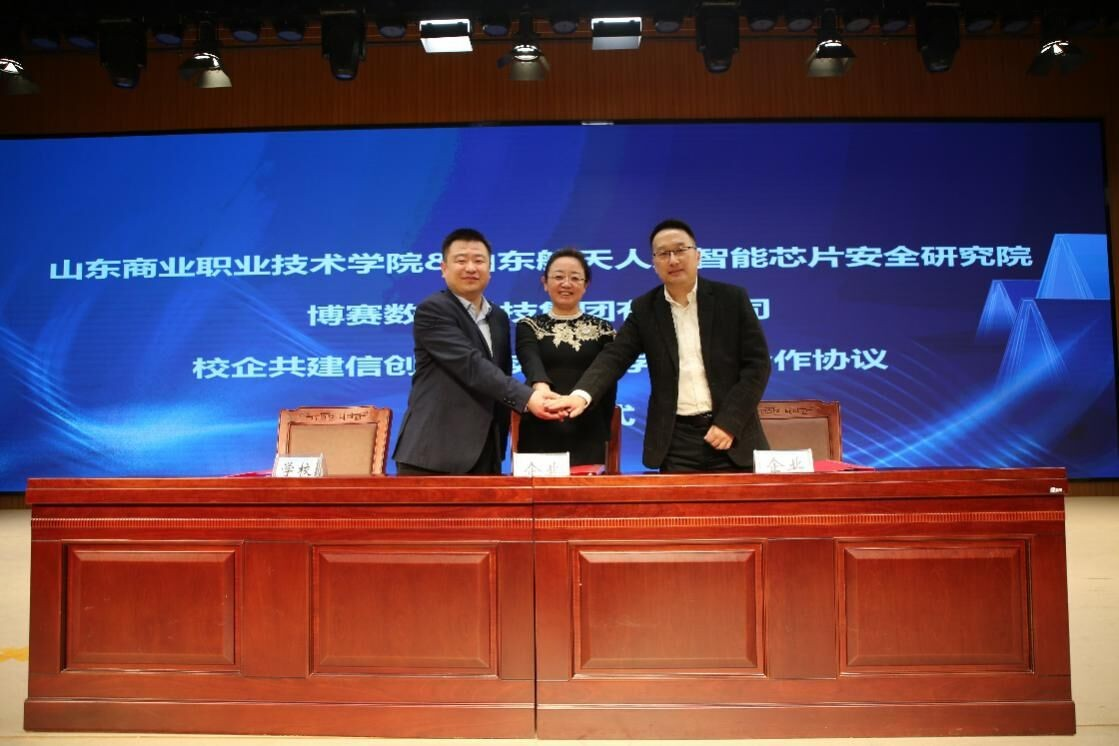 王鑫代表学校与山东航天人工智能安全芯片研究院和博赛数字科技集团(山东)有限公司签订三方共建信创人才实训基地协议,并与孟庆云共同为校内信创适配中心揭牌。