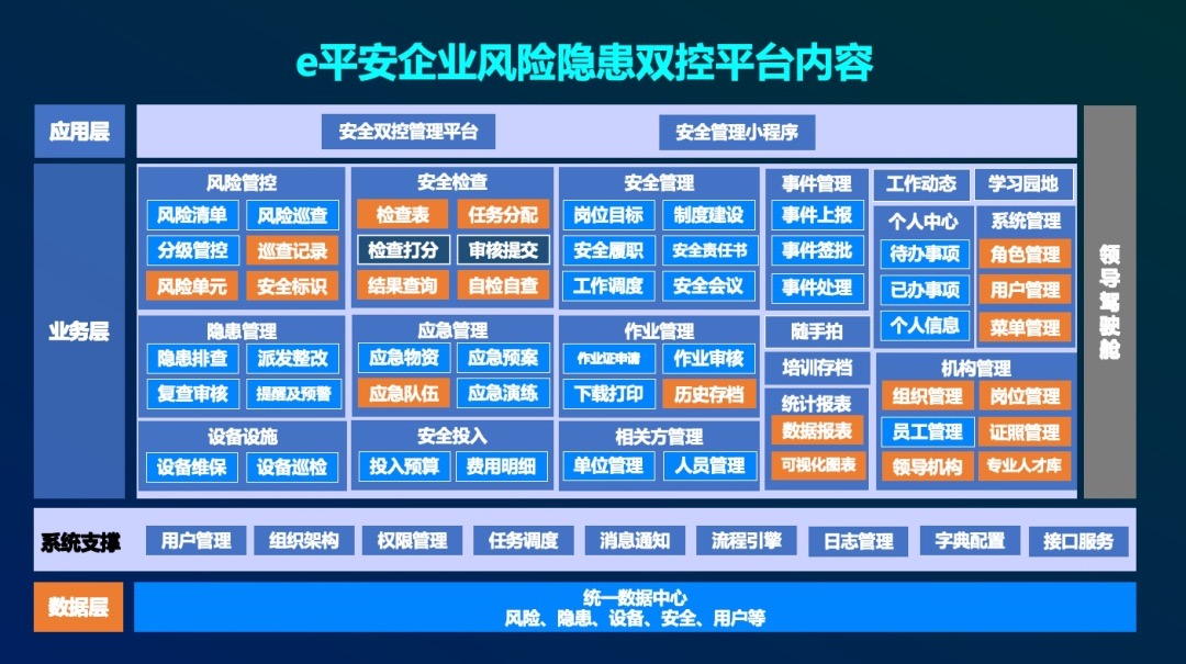 “e平安”企业风险隐患双控管理项目充分应用互联网、大数据分析等新技术,涵盖新闻动态、工作通知、安全通报、安全知识、法律法规、智能安全设备监控等内容。利用移动办公技术,通过便捷化流程指引、专业化数据支撑,实现企业日常安全高效自主管理,助力企业持续提升安全管理水平、全面提升安全管理工作效率,数字化展现安全生产管理成果,为企业的发展保驾护航。