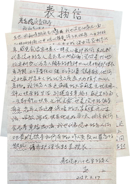 3月的一个上午,济南鲁商福瑞达护理院三楼护理长乔丽萍像往常一样进行巡房,一进入318房间,屋里的赵奶奶便拿起几张信纸招呼她道:“乔,谢谢你们这一年的照顾,我写了一封信麻烦你转交给领导!”