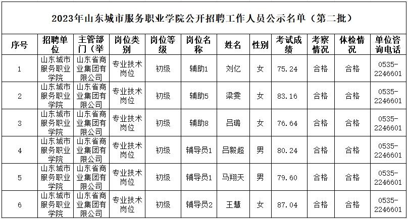 根据《中共山东省委组织部、山东省人力资源和社会保障厅关于印发2023年度省属事业单位公开招聘工作实施方案的通知》(鲁人社发〔2022〕23号)等相关规定,山东城市服务职业学院经过公开招聘报名、考试、考察、体检等工作,现对拟聘用人员(第二批)进行公示,公示期为7个工作日,自2023年11月23日至2023年12月1日(不含节假日)。公示期间,如对公示人选有异议,请及时向必赢唯一官方网站反映。