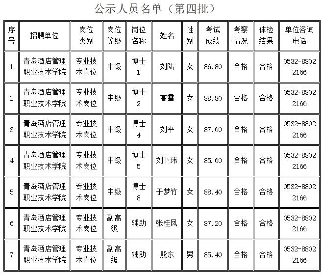 根据省属事业单位公开招聘有关政策规定,按照岗位招聘计划,青岛酒店管理职业技术学院组织完成了公开招聘考试、考察、体检等工作,现对该单位第四批拟聘用人员进行公示。公示期为7个工作日,自2024年7月10日至2024年7月18日(不含节假日)。公示期间,如对公示人选有异议,请向必赢唯一官方网站反映。反映问题要实事求是,并告知真实姓名及联系方式。